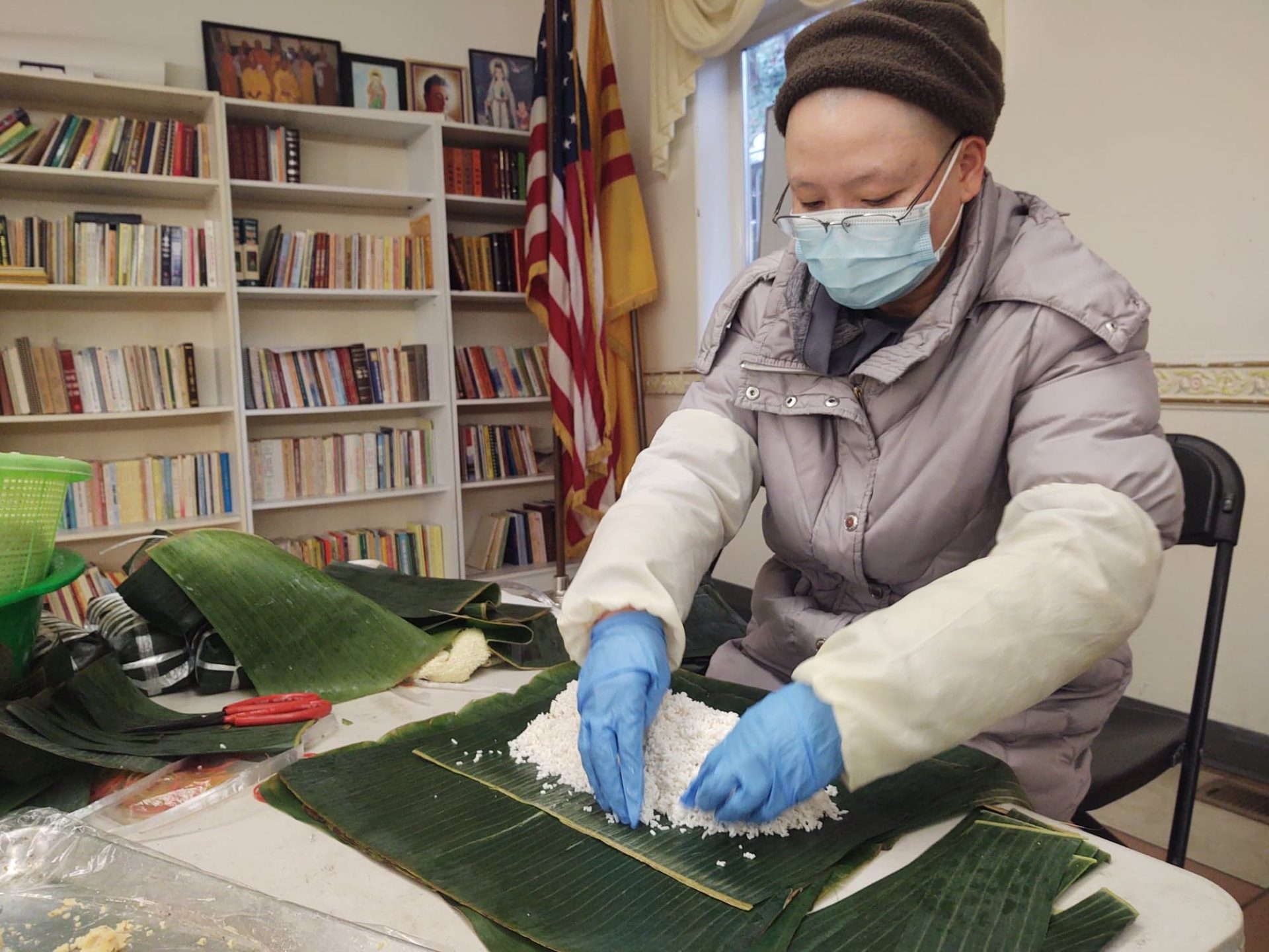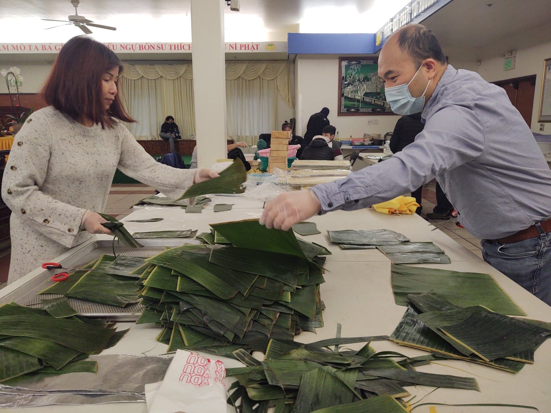 Hơn ba tuần nay vợ chồng bà Sồi, cư dân Seattle, có mặt đều đặn ở nơi gói bánh mỗi ngày. Tại đây, công việc của bà là lau lá chuối. Có bảy người cùng bà làm công việc lau lá. Còn ông đi đến các chợ để lấy nếp, đậu… lá chuối giao cho người rửa, vo đãi tại nhà, sau đó mang đến đây.