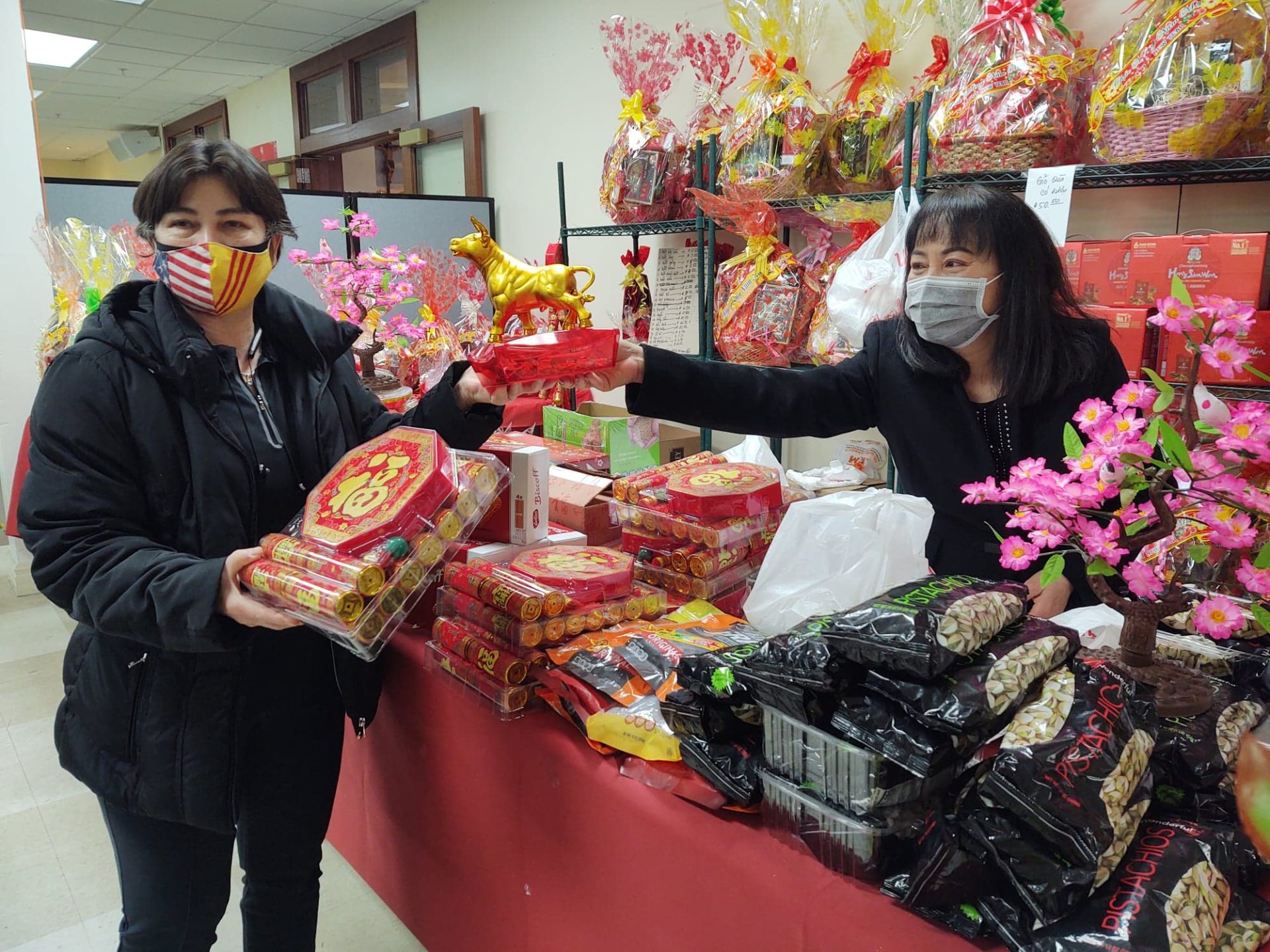 Bước vào bên trong nhà thờ, trước mặt tôi là một chiếc xe Camry đời 2021 được trang trí bắt mắt đặt ngay cửa vào một hội trường lớn. Đây là giải thưởng đặc biệt cho xổ số Tết Tân Sửu. Phía sau là quầy bánh mứt, các loại vật phẩm trưng bày cho ngày Tết. Nhìn chẳng khác một quầy bán đồ Tết cỡ lớn ở Sài Gòn, hay tại một ngôi chợ nào đó ở Việt Nam.