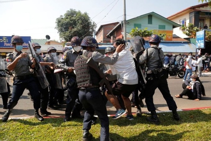 Người biểu tình bị cảnh sát bắt giữ ở Mawlamyine hôm 12/2. Ảnh: Reuters