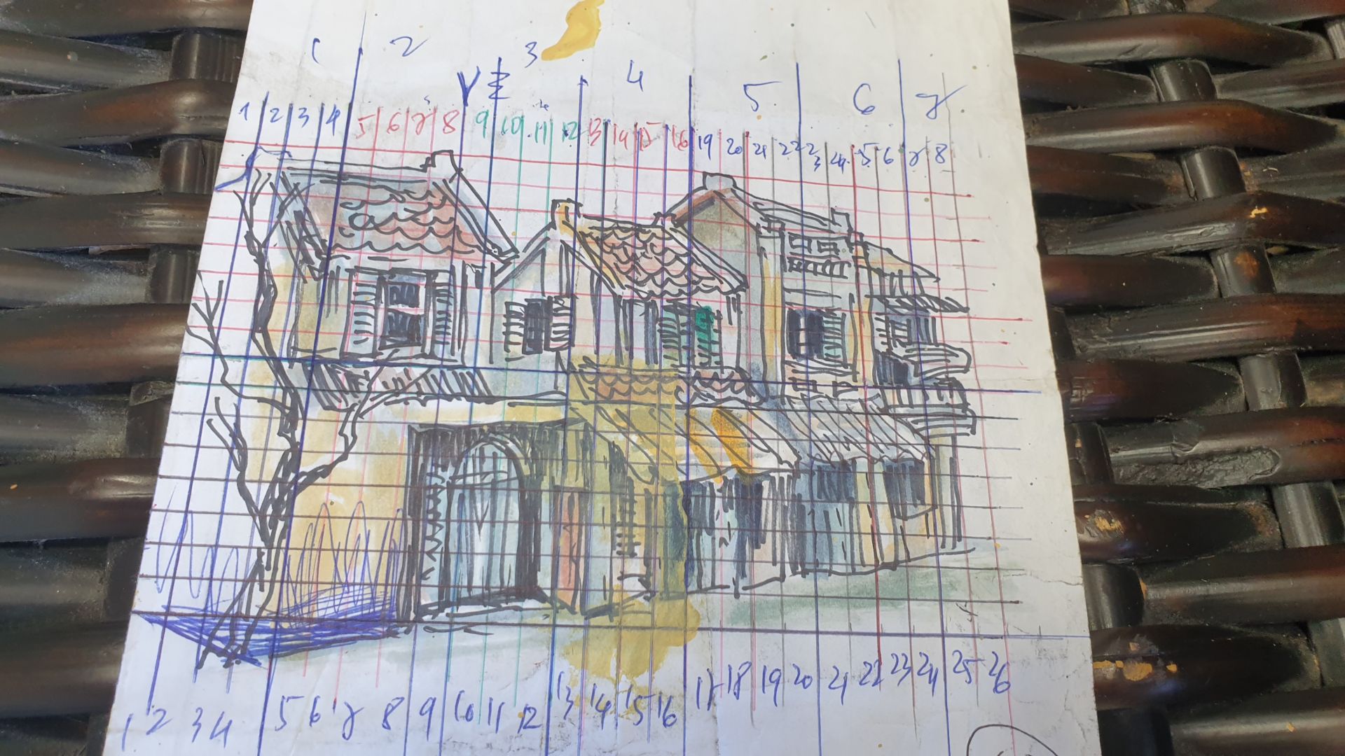 Để có một tranh cỡ lớn treo trên sân khấu, ông Nguyễn Thành Thống vẽ bản thảo rất kỹ và chia ca rô thật cẩn thận rồi vẽ theo đó. (Hình: Đằng-Giao/Người Việt)
