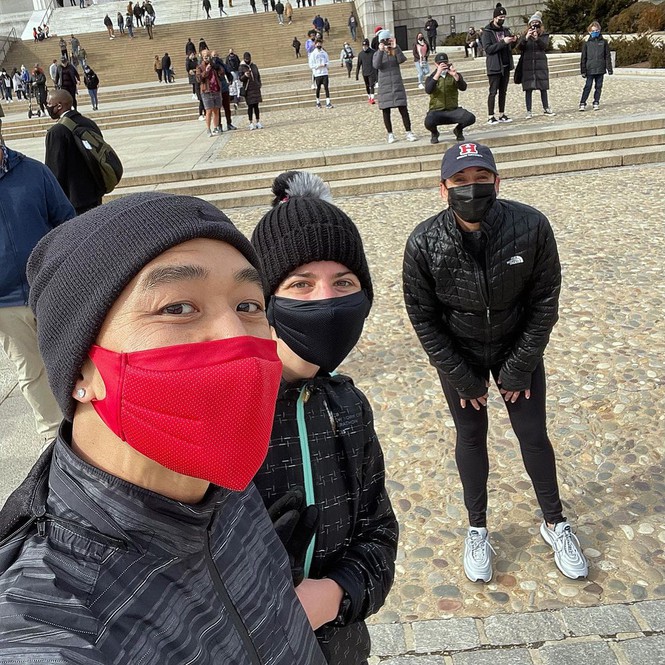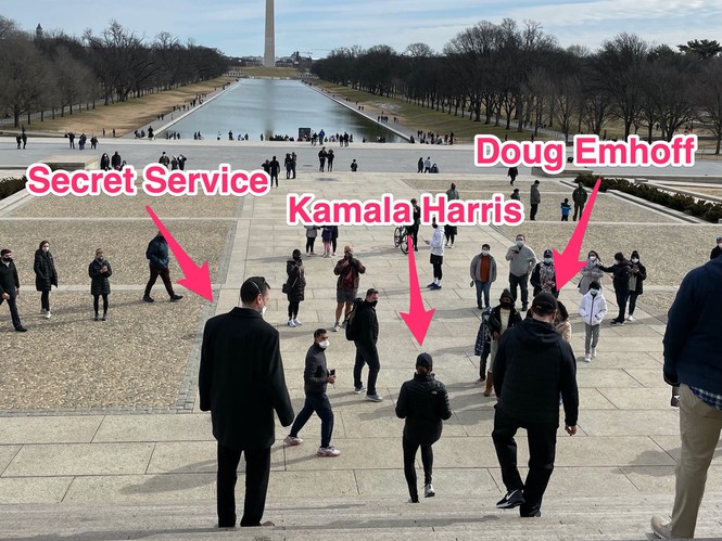 Theo BI, Tran và bạn gái phát hiện bà Harris đang chạy lên chạy xuống cầu thang dưới chân Đài tưởng niệm Lincoln cùng phu quân Doug Emhoff và nhân viên mật vụ.