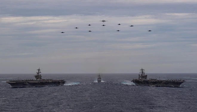 Hai nhóm tác chiến tàu sân bay Mỹ USS Theodore Roosevelt và USS Nimitz hoạt động trên biển Đông hôm 9-2-2021. Ảnh Hải quân Mỹ