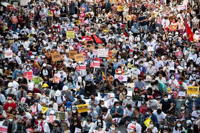 Người dân Myanmar biểu tình, yêu cầu chính quyền quân sự Myanmar từ bỏ quyền lực và trả tự do cho lãnh đạo Aung San Suu Kyi. Ảnh: Reuters