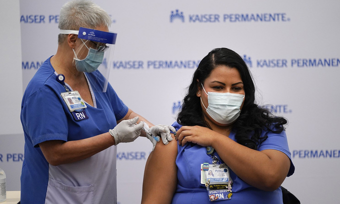 Một nhân viên y tế được tiêm vaccine Covid-19 tại trung tâm y tế Kaiser Permanente ở Los Angeles, bang California, Mỹ, hồi tháng 12/2020. Ảnh: AP.