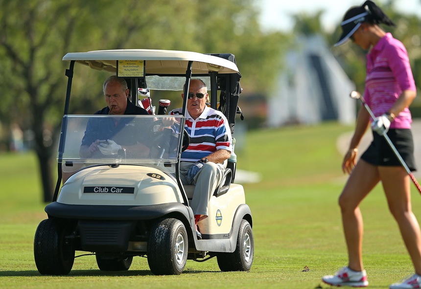 Rudy Giuliani và Rush Limbaugh nhìn bà Michelle Wie chơi golf tại giải Els for Autism Pro-am ngày 10/3/2014. Ảnh: Getty.