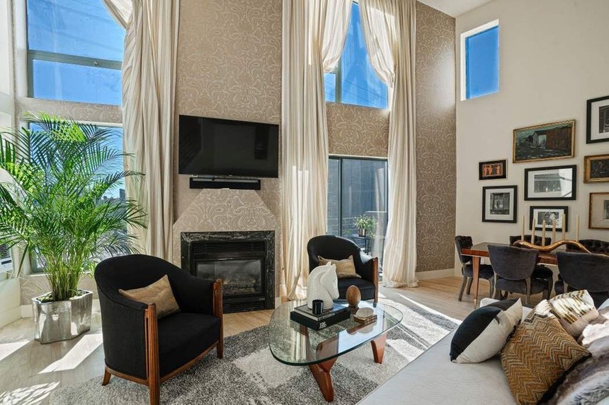 Phòng khách thoáng đãng, sang trọng, được thiết kế với trần nhà cao và những ô cửa sổ cỡ lớn mang đến khung cảnh thành phố.