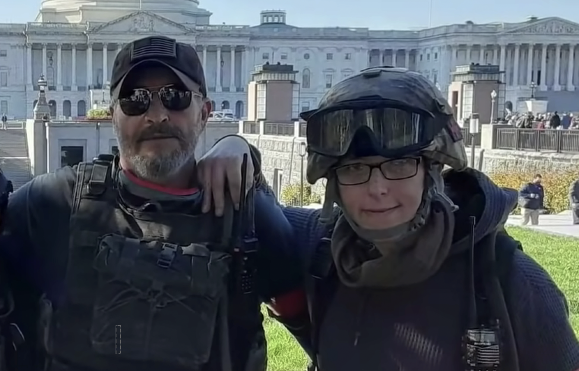 Bà Jessica Watkins (phải) trong trang phục “tác chiến” trước toà nhà Quốc Hội ngày 6 Tháng Giêng. (Hình chụp trên màn ảnh Sky News)