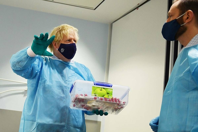 Thủ tướng Anh Boris Johnson thăm một phòng thí nghiệm xử lý các xét nghiệm Covid-19 ở Glasgow. Ảnh: Bloomberg.
