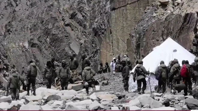 Hình ảnh từ phóng sự của đài CCTV (Trung Quốc), nói rằng các binh sĩ Ấn Độ tập trung số lượng lớn tại thung lũng Galwan ở biên giới Trung-Ấn vào tháng 6/2020