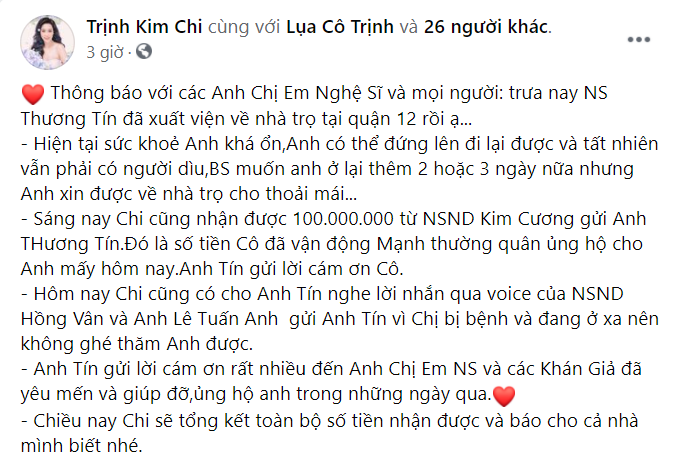 Chia sẻ về tình hình sức khỏe của nghệ sĩ Thương Tín, Trịnh Kim Chi viết: "Hiện tại sức khoẻ anh khá ổn, anh có thể đứng lên đi lại được và tất nhiên vẫn phải có người dìu, bác sĩ muốn anh ở lại thêm 2 hoặc 3 ngày nữa nhưng anh xin được về nhà trọ cho thoải mái". Ngoài những thông tin về tình hình sức khỏe của nam nghệ sĩ, Trịnh Kim Chi còn chia sẻ với người hâm mộ, cô vừa nhận thêm 100 triệu từ phía các mạnh thường quân mà nghệ sĩ Kim Cương là người đại diện gửi cho NS Thương Tín.