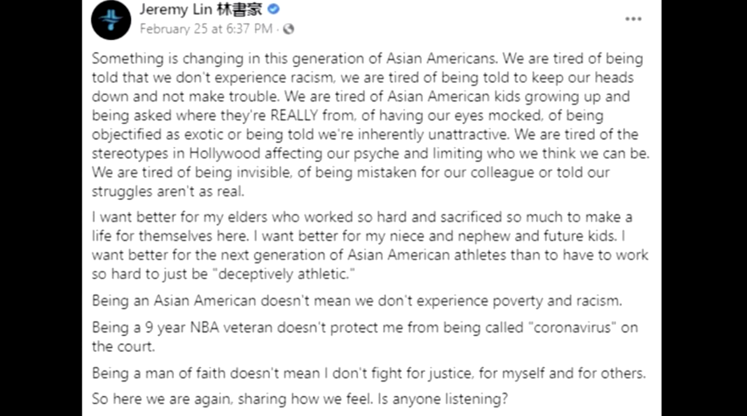 Trong bài đăng trên Facebook, anh viết rằng là một cầu thủ bóng rổ NBA 9 năm nhưng anh vẫn bị gọi là “coronavirus” trên sân. Anh không tiết lộ cụ thể về thời gian hoặc địa điểm xảy ra sự việc. Nhiều người gốc Á nói rằng họ đã phải chịu đựng những tình huống tương tự kể từ năm ngoái, kể từ khi cựu Tổng thống Donald Trump mô tả coronavirus là “virus Trung Cộng”.