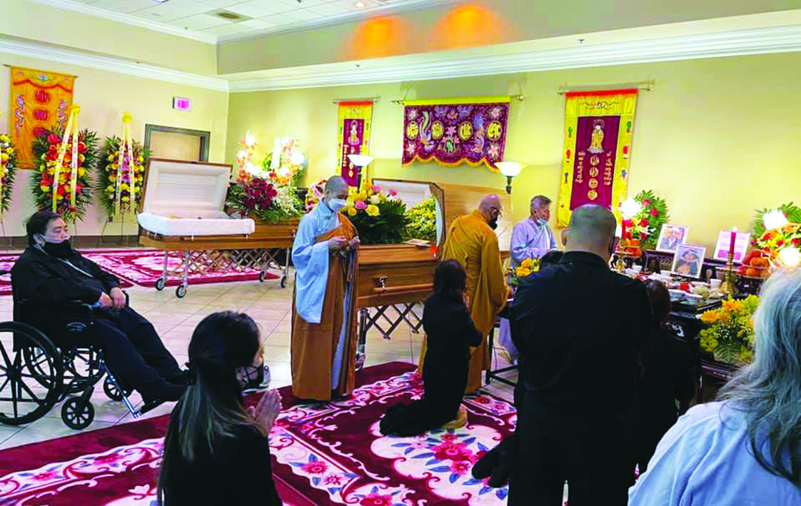 Buổi lễ nhập liệm tại nhà quàn sáng thứ Hai, 1 tháng 3, 2021. Có ông Lưu Trọng ngồi trên xe lăn bên trái. (Chua Quang Duc Facebook)