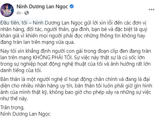Sau đó, đích thân nữ diễn viên cũng mạnh mẽ phủ nhận thông tin gây ảnh hưởng đến danh tiếng bản thân:“Tôi gửi lời xin lỗi đến các đối tác, người thân, gia đình, bạn bè và đặc biệt là quý khán giả vì khiến mọi người phải đọc những thông tin không hay đang tràn lan trên mạng. Tôi xin khẳng định người con gái trong đoạn video đen đang tràn lan trên mạng không phải tôi. Sự việc là cú sốc lớn trong sự nghiệp hoạt động nghệ thuật và ảnh hưởng lớn tới danh tiếng của tôi. Tôi luôn giữ gìn hình ảnh thật kỹ, không bao giờ cho phép xảy ra những sự việc như thế này”.