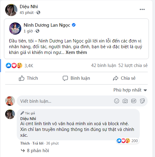 Diệu Nhi thì chia sẻ lại bài viết của Lan Ngọc kèm lời nhắn nhủ netizen: "Ai bình luận linh tinh vô văn hoá mình xin xoá và block nhé. Xin chỉ lan truyền những thông tin đúng sự thật và chính xác".