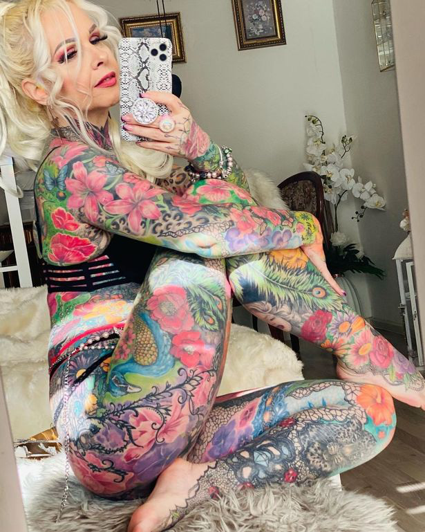 Người phụ nữ U60 được bao phủ kín bởi những hình xăm từ cổ đến chân. Người mẫu đến từ Leipzig, Đức, ước tính cô chi khoảng 35.000 bảng Anh cho những hình xăm nghệ thuật đầy màu sắc của mình, thứ mà cô ấy tin chắc rằng đã che được 90% cơ thể, sau khi người mẫu hình xăm Kerstin Ehe đã chia sẻ về sự thay đổi đáng kinh ngạc của mình. Cô từng "ghét cay ghét đắng" mực xăm nhưng giờ đây, trên cơ thể người phụ này lại có hàng tá những hình xăm thiết kế xuyên suốt từ cổ đến chân.
