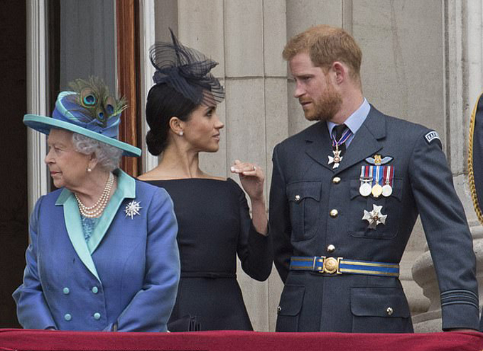 Nữ hoàng Elizabeth II và vợ chồng Meghan - Harry trên ban công Điện Buckingham hồi năm 2018. Ảnh: Newspix.