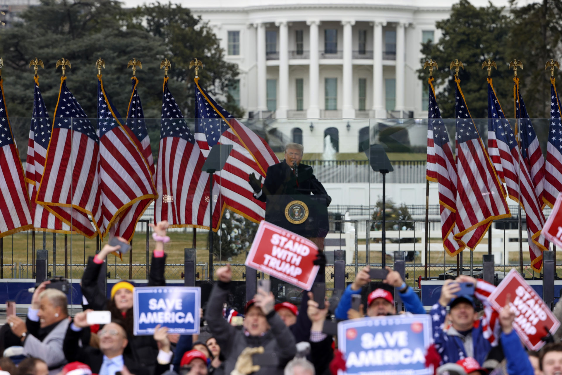 Cựu Tổng Thống Trump phát biểu tại cuộc biểu t́nh phản đối kết quả bầu cử ở Washington, DC, hôm 6 Tháng Giêng. (H́nh minh họa: Tasos Katopodis/Getty Images)