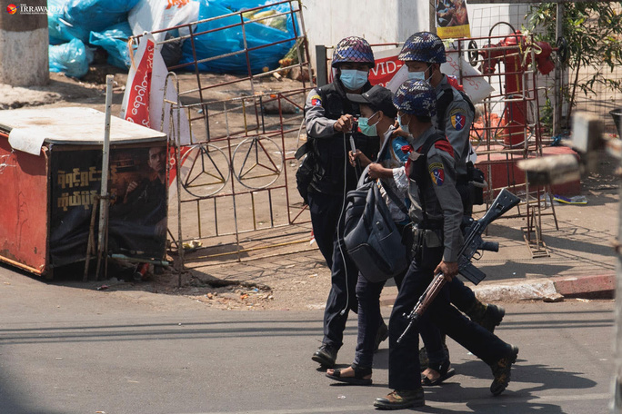 Cảnh sát Myanmar bắt giữ người biểu tình ở TP Yangon. Ảnh: The Irrawaddy