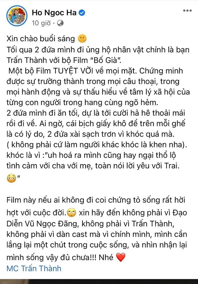 Giữa làn sóng tranh cãi đang bùng nổ ở các diễn đàn, diễn viên Chi Bảo bất ngờ chia sẻ hình ảnh chụp đoạn viết của Hồ Ngọc Hà và cho biết: "Mấy hôm nay đọc lời khen về phim "Bố già" rất nhiều, thấy vui trong lòng.