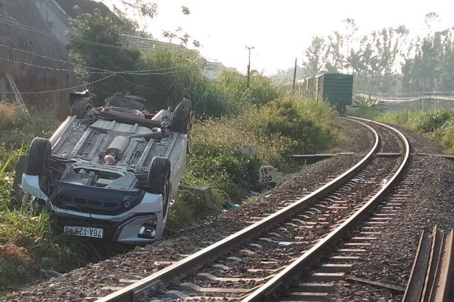Cú đâm trực diện của tàu hàng khiến ô tô 7 chỗ văng ra xa, lật ngửa. Vụ tai nạn làm cháu bé tử vong, 2 vợ chồng anh M. bị thương nặng.