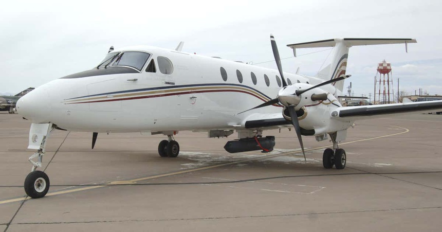 Phiên bản C-12J của phi đội thử nghiệm 586 với một mẫu thử nghiệm bên dưới bụng. Ảnh: USAF.