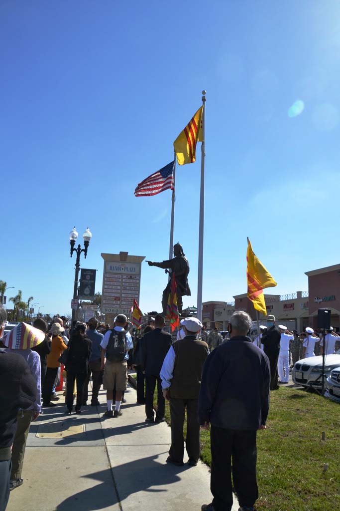 Hai lá quốc kỳ Việt Nam Cộng Hòa và Hoa Kỳ lần lượt được kéo lên hai đỉnh cột cờ trong tiếng hát vang dội của hai bản quốc ca. Sau đó, mọi người dành phút thinh lặng tưởng niệm anh linh các chiến sĩ và đồng bào đã hy sinh vì tổ quốc.