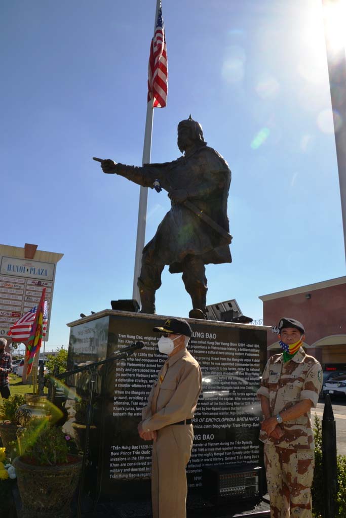 “Thưa đồng hương. Thời gian trôi qua rất nhanh, thấm thoắt đã bảy năm rồi, từ ngày thành lập và thượng tượng của Ngài cũng như đền thờ của Ngài trên đại lộ Bolsa này, và với mục tiêu trước tiên chúng tôi làm việc này để giữ ngọn lửa, lấy tinh thần của Ngài để toàn dân noi theo, trong nước cũng như hải ngoại phải giữ nước khỏi rơi vào tay Tầu Cộng trong tương lai. Đó là ý nghĩa cuộc dựng tượng cũng như là đền thờ.