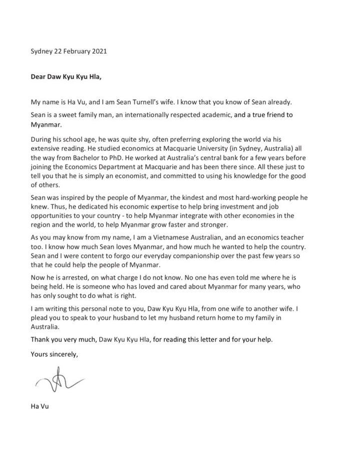 Được biết, sau khi Giáo sư Turnell bị chính quyền quân sự Myanmar bắt giữ, hàng trăm học giả Úc đã cùng ký thỉnh nguyện thư gửi tới Đại sứ quán Myanmar tại Canberra yêu cầu trả tự do cho ông. Vào cuối tháng 2 vừa qua, bà Ha Vu, người vợ gốc Việt của ông Turnell cũng đã viết lá thư gửi vợ Thống tướng Min Aung Hlaing, với lời thỉnh cầu: "Xin hãy cho chồng tôi trở về Úc với gia đình".