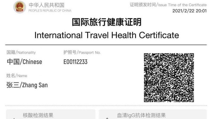 Mẫu chứng nhận y tế được xem là "hộ chiếu vaccine" đối với công dân Trung Quốc. Ảnh:Twitter/Shen_shiwei.