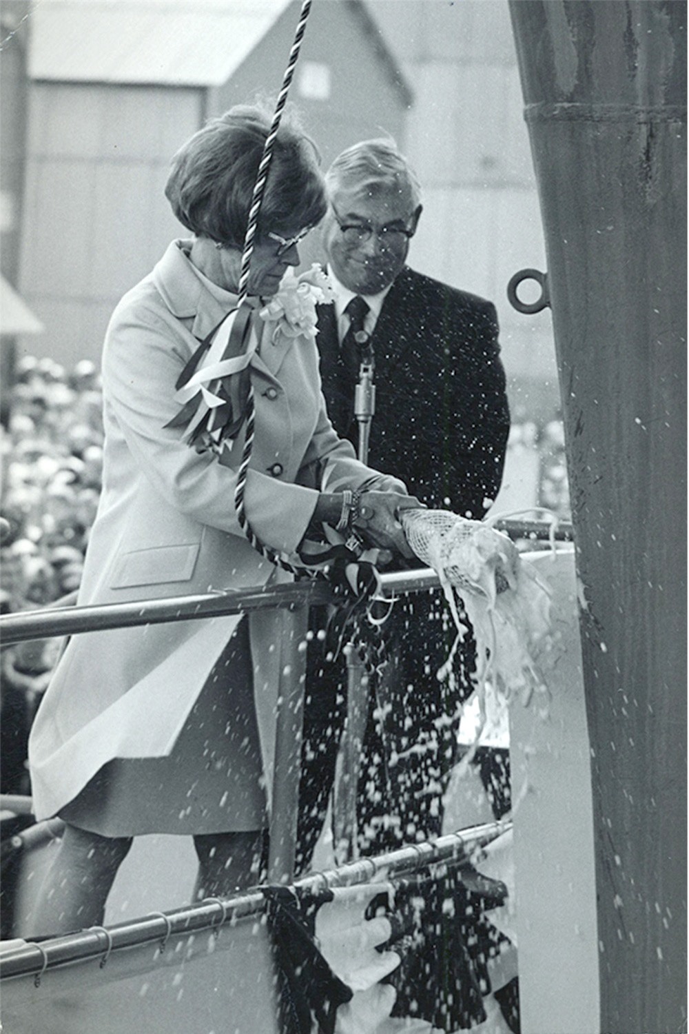 Catherine Nimitz Lay đập chai sâm-panh trong nghi thức "rửa tội" cho tàu USS Nimitz. Ảnh: Hải quân Mỹ