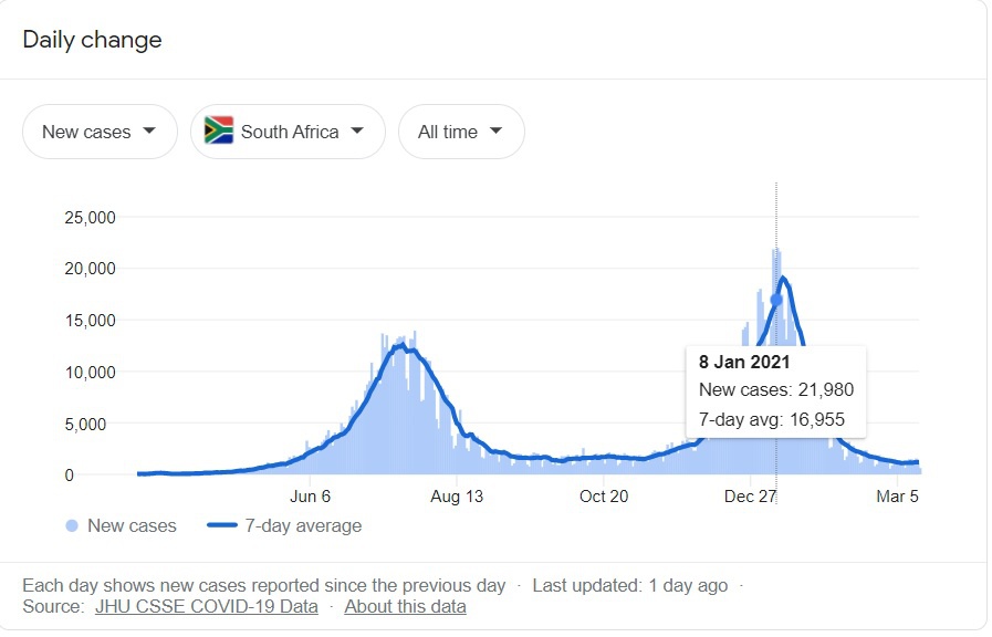 Số ca nhiễm Covid-19 theo ngày của Nam Phi giảm mạnh từ mức kỷ lục gần 22.000 ca/ngày xuống còn khoảng 1.000 ca/ngày. Ảnh: JHU CSSE COVID-19 Data.