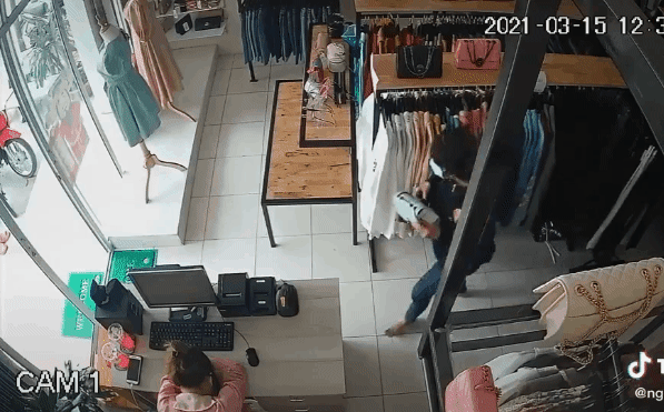 Nữ đạo chích bịt khẩu trang, khẽ mở cửa vào shop trộm một bộ quần áo và cái túi xách. Trên đường lẻn ra ngoài, cô này vấp vào cạnh bàn khiến nữ nhân viên choàng tỉnh. Người bán hàng tưởng khách muốn thanh toán nên nhanh chóng tính tiền 3 món đồ.