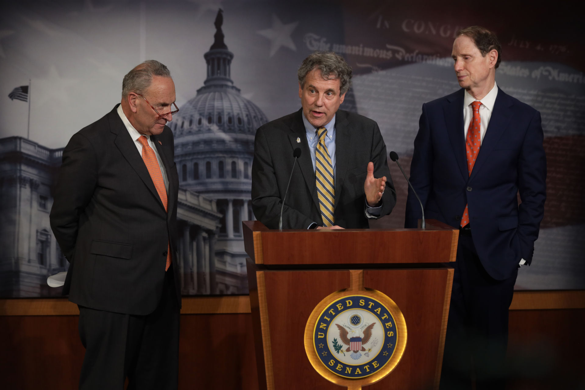 Ba vị thượng nghị sĩ Dân Chủ, từ trái, Chuck Schumer (New York), Sherrod Brown (Ohio), và Ron Wyden (Oregon). (Hình: Alex Wong/Getty Images)