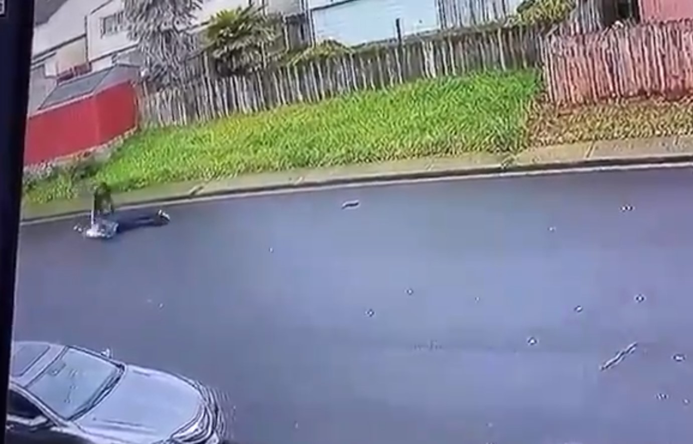 Video từ camera an ninh cho thấy nghi can chạy ập đến từ phía sau nạn nhân, vật bà ngã xuống đất, giật giỏ xách của bà rồi bỏ chạy.
