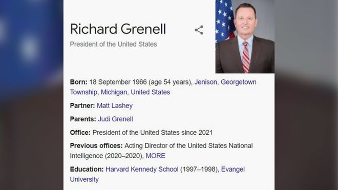 Dịch vụ t́m kiếm của Google cho kết quả rằng Tổng thống Mỹ là ông Richard Grenell, cựu quan chức dưới thời ông Trump, trước khi sửa lỗi.Ông Richard Grenell, cựu quyền giám đốc t́nh báo quốc gia Mỹ dưới thời Tổng thống Donald Trump, đă vô cùng vui sướng “lợi dụng cơ hội” từ một sai sót của Google về việc công nhận ông là “Tổng thống Mỹ từ năm 2021”.
