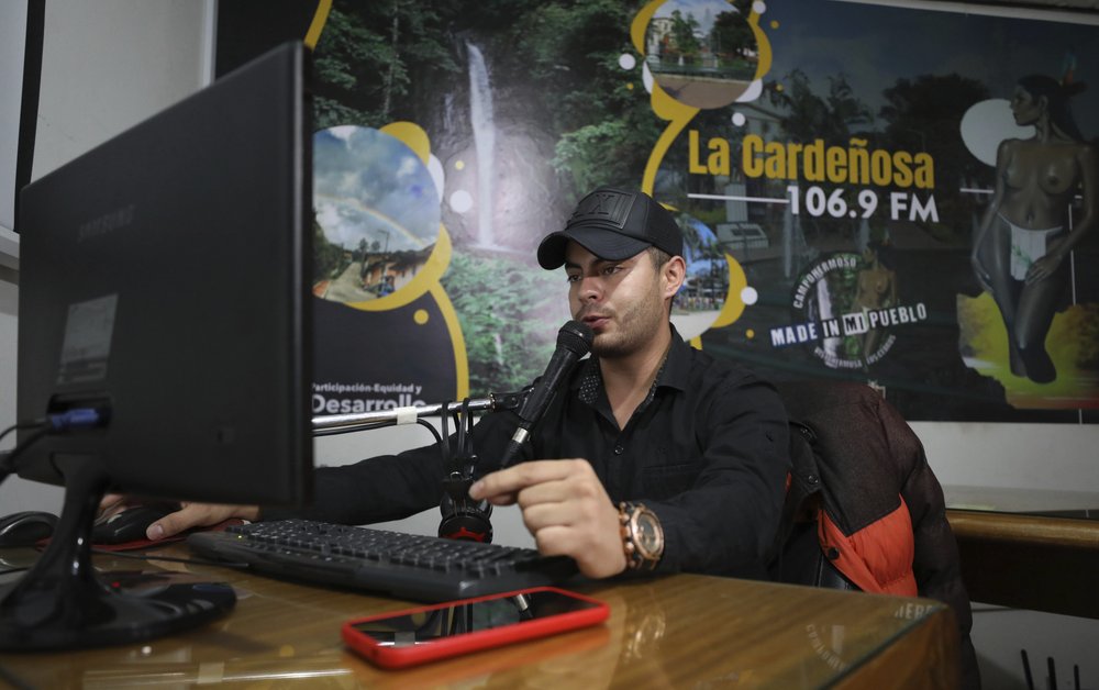 Phát thanh viên Cristian Sanchez thông báo về phòng ngừa dịch COVID-19 trên đài phát thanh địa phương ở Campohermoso, Colombia. Ảnh: AP