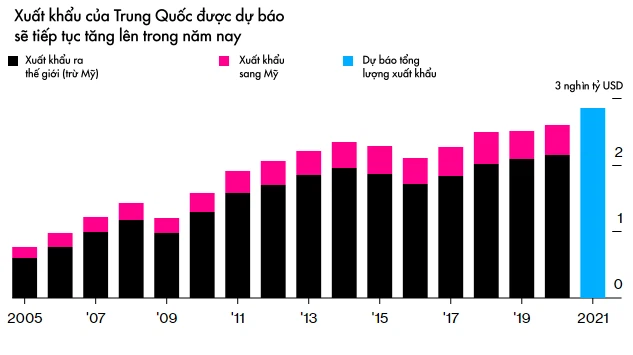 Theo tin, xuất khẩu của Trung Quốc có thể sẽ tăng thêm 60 tỷ USD trong giai đoạn 2021-2022, khi người dân Mỹ mua máy tính, thiết bị gia dụng và quần áo. khiến có khoảng 360 tỷ USD trong gói kích thích sẽ được chi tiêu cho nhập khẩu.