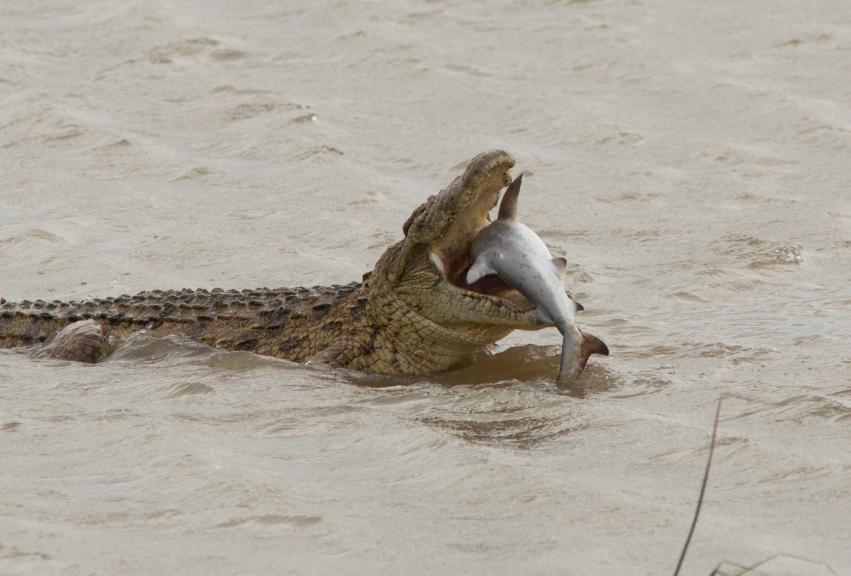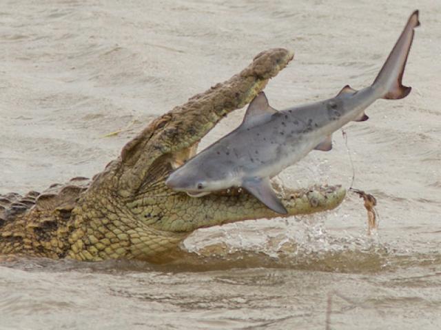 Con cá mập bò trở thành mồi ngon cho cá sấu.