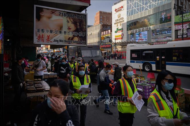Các thành viên đội tuần tra bảo vệ người Mỹ gốc châu Á mang tên Public Safety Patrol (PSP) tuần tra tại New York, Mỹ, ngày 23/3/2021. Ảnh: AFP/TTXVN