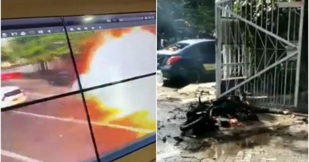 Hình ảnh từ camera an ninh cho thấy vụ nổ rất mạnh, khiến lửa, khói và các mảnh vỡ bay tung tóe giữa đường.