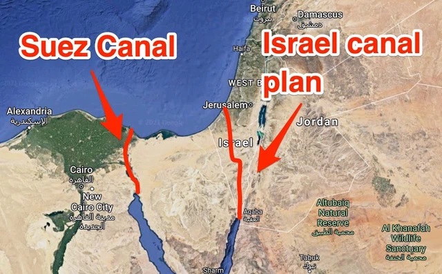 Tấm bản đồ cho thấy vị trí của kênh đào Suez hiện tại (đường màu đỏ bên trái) và tuyến kênh đào xuyên qua Israel mà Mỹ từng xem xét vào những năm 1960 (đường màu đỏ bên phải). Ảnh: Insider