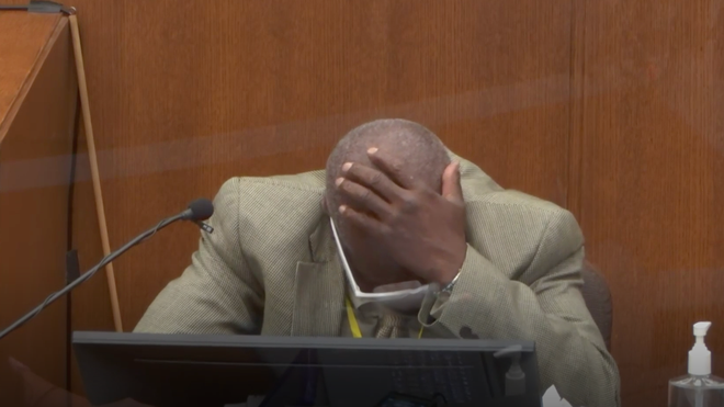 Ông Charles McMillian, người chứng kiến khoảnh khắc cảnh sát khống chế George Floyd, khóc nức nở khi xem đoạn video được phát tại tòa về cảnh nạn nhân gọi mẹ.