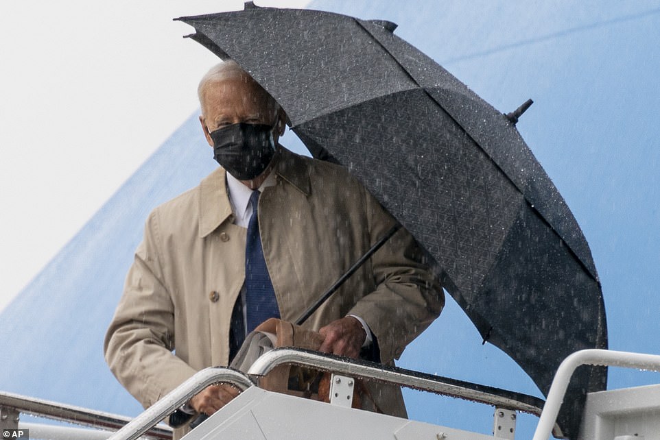 Ông Biden lại gặp một chút rắc rối nhỏ khi che ô trong trời mưa, bước lên cầu thang để vào chuyên cơ Không lực Một trong hành trình đến Pittsburgh, bang Pennsylvania gây lo ngại về sức khoẻ.
