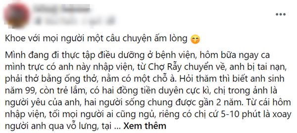 Theo đó, chủ nhân bài viết hiện đang đi thực tập điều dưỡng tại bệnh viện. Đúng hôm có ca trực nên cô nàng đã chứng kiến một câu chuyện tình yêu cảm động khiến bất cứ ai đọc xong cũng muốn được yêu ngay lập tức.