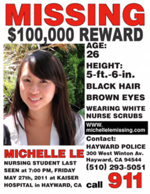 Gia đình thông báo về việc Michelle Le mất tích và treo giải thưởng cho những ai cung cấp thông tin để tìm được nữ sinh này.