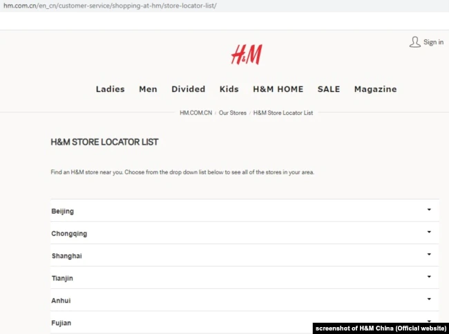 Trang web của H&M ở Trung Quốc không có bản đồ các cửa hàng. 5/4/2021