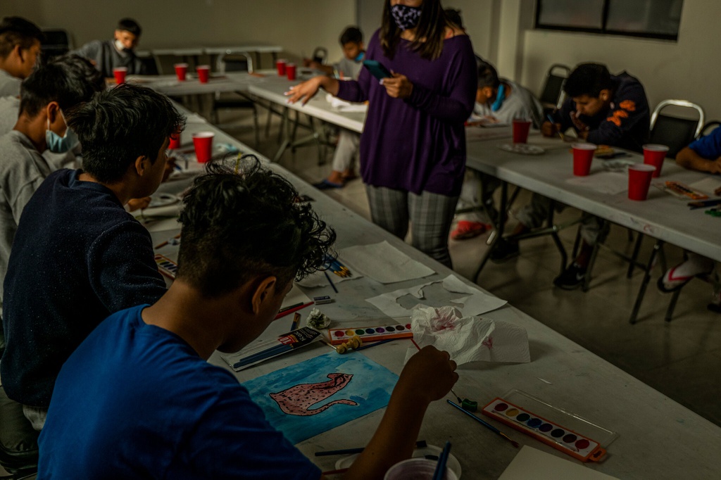 Trong vài tháng sống ở cơ sở tạm trú, các em phải tạm dừng việc học văn hóa. Các em chuyển sang học các môn nghệ thuật, như vẽ tranh về đất nước của mình. Ảnh: New York Times.