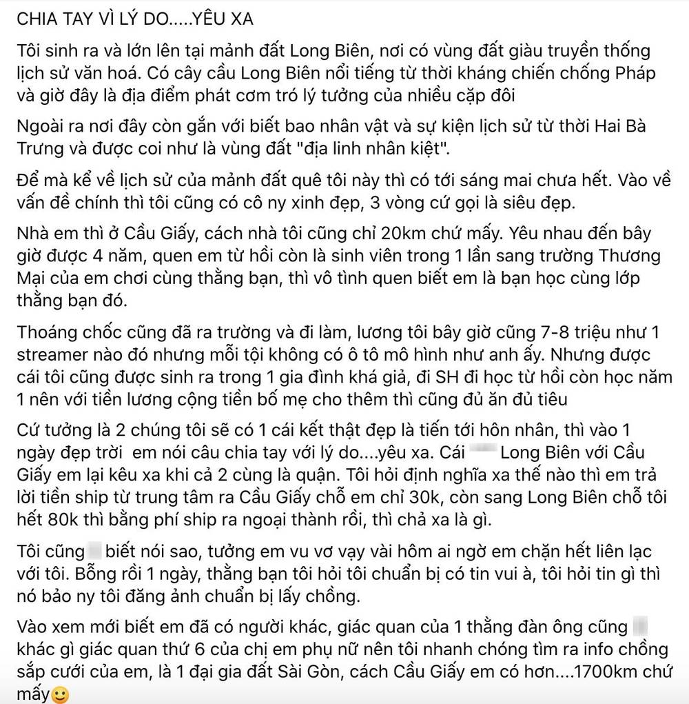 “Cứ tưởng là 2 chúng tôi sẽ có 1 cái kết thật đẹp là tiến tới hôn nhân, thì vào 1 ngày đẹp trời em nói câu chia tay với lý do….yêu xa. Long Biên với Cầu Giấy em lại kêu xa khi cả 2 cùng là quận. Tôi hỏi định nghĩa xa thế nào thì em trả lời tiền ship từ trung tâm ra Cầu Giấy chỗ em chỉ 30k, còn sang Long Biên chỗ tôi hết 80k thì bằng phí ship ra ngoại thành rồi, thì chả xa là gì”, anh chàng tâm sự.