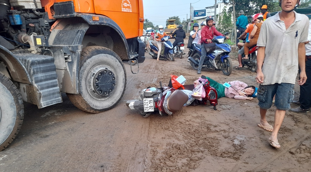 Một người phụ nữ đi xe máy ngất xỉu tại hiện trường khi bị xe ben chở cát cán nát chân trái, khiến con gái 9 tuổi gào khóc thảm thiết, làm cho nhiều người đi đường không cầm được nước mắt về vụ tai nạn của hai mẹ con.