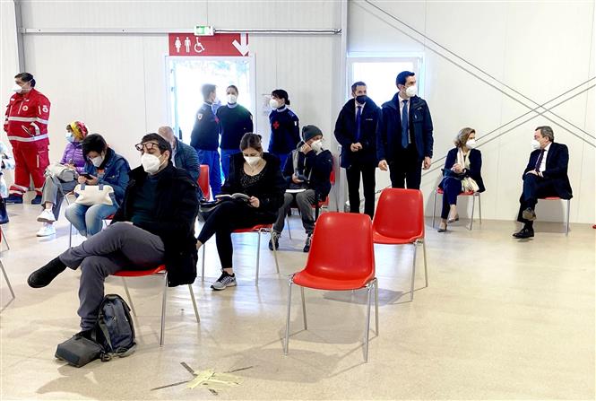 Thủ tướng Italy Mario Draghi (phải) cùng phu nhân Maria Serenella Cappello (thứ 2, phải) chờ tiêm vaccine ngừa COVID-19 tại Rome. Ảnh: AFP/TTXVN